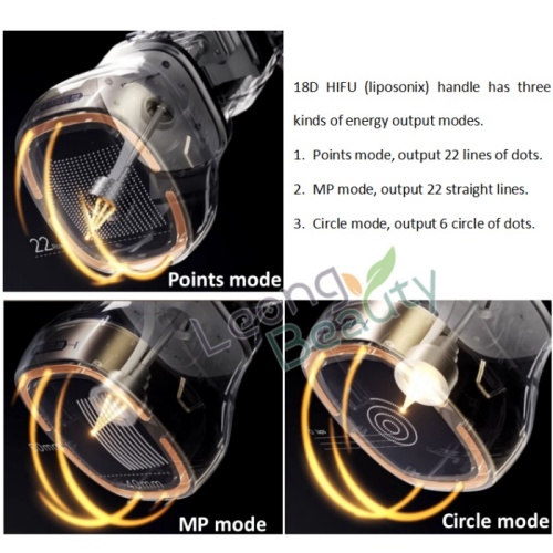 दूसरे हैंडल को 18D HIFU कहा जाता है इसमें 3 मोड, 22 स्ट्रेट लाइन मोड, 22 लाइन ऑफ़ डॉट्स मोड और सर्कल मोड हैं।